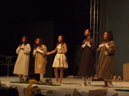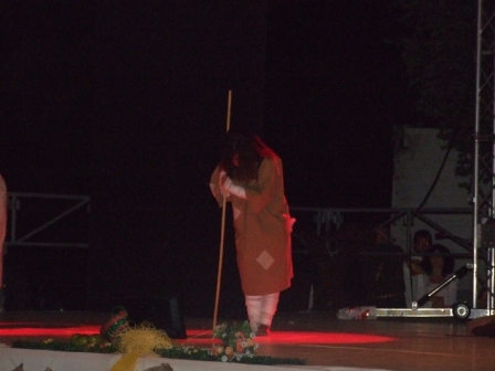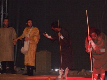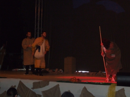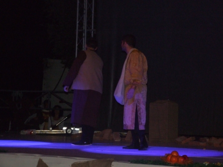 | Quarta scena: Bernardone cerca di comprendere il segreto del saio di Francesco. Solo con lo sguardo di Madonna Povertà si può accogliere "quel che vale"...! |